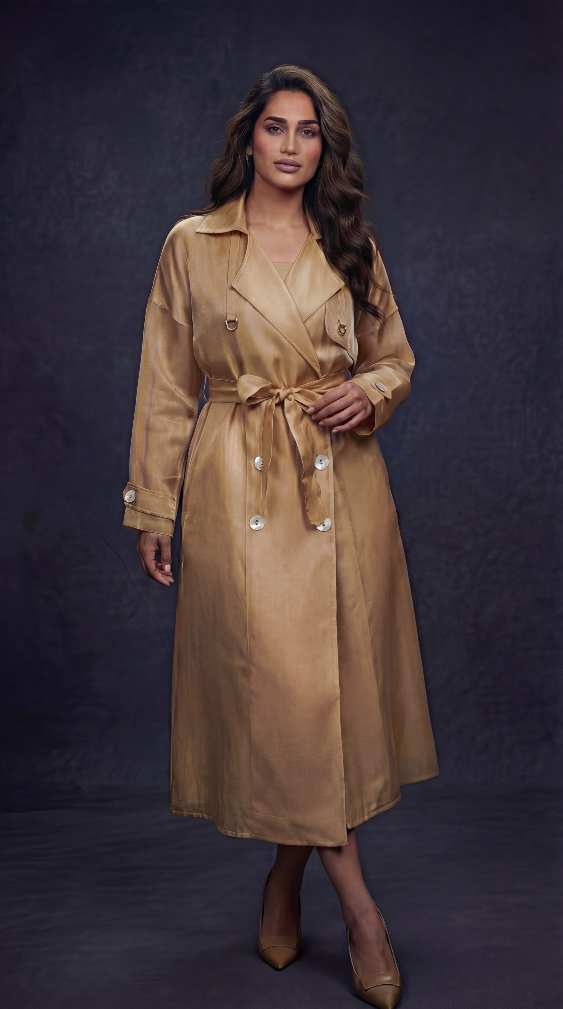 Command elegance with The Golden Hour Trench Dress, a refined trench-style dress crafted for modern sophistication. Designed in luxurious satin organza this piece balances structure and softness—making it perfect for evenings, elevated workwear, and statement occasions.